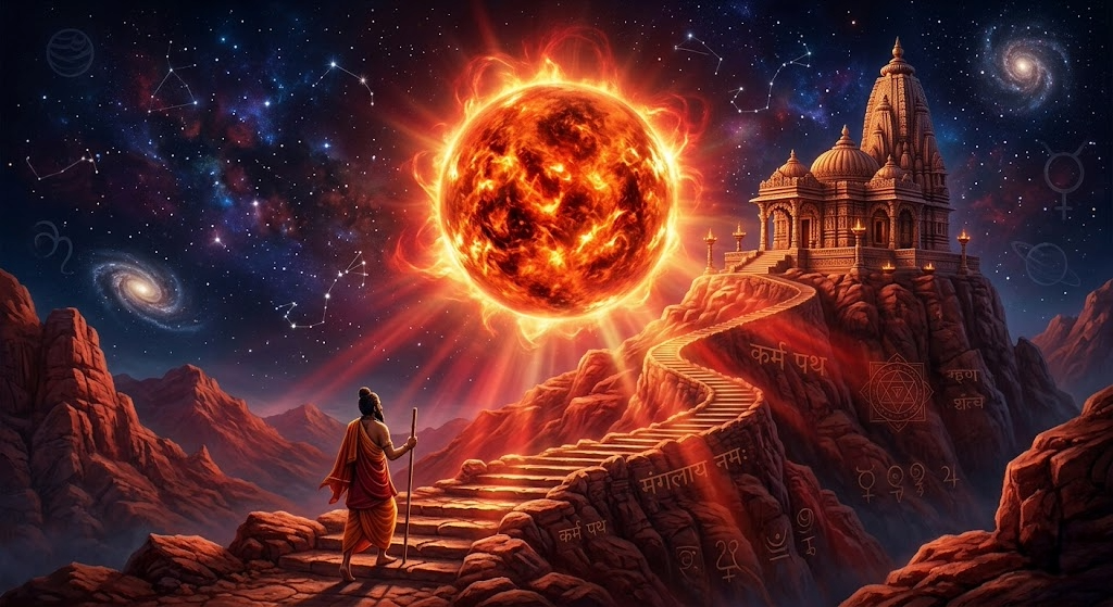 In Vedic astrology, Mars represents action, energy, courage, and discipline, while the 9th house (Bhagya Bhav) governs luck, dharma, father, higher knowledge, and destiny.