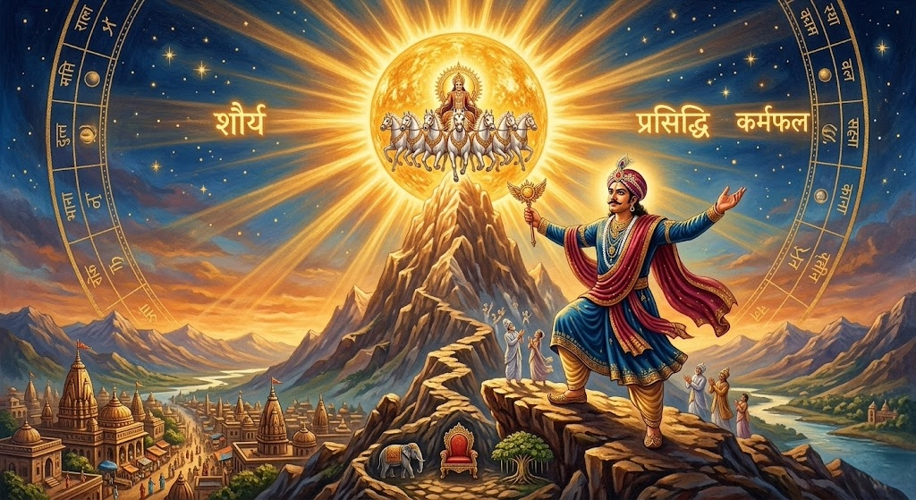 In Vedic astrology, the Sun represents authority, leadership, confidence, and power, while the 10th house (Karma Bhav) governs career, profession, reputation, status, and public image.