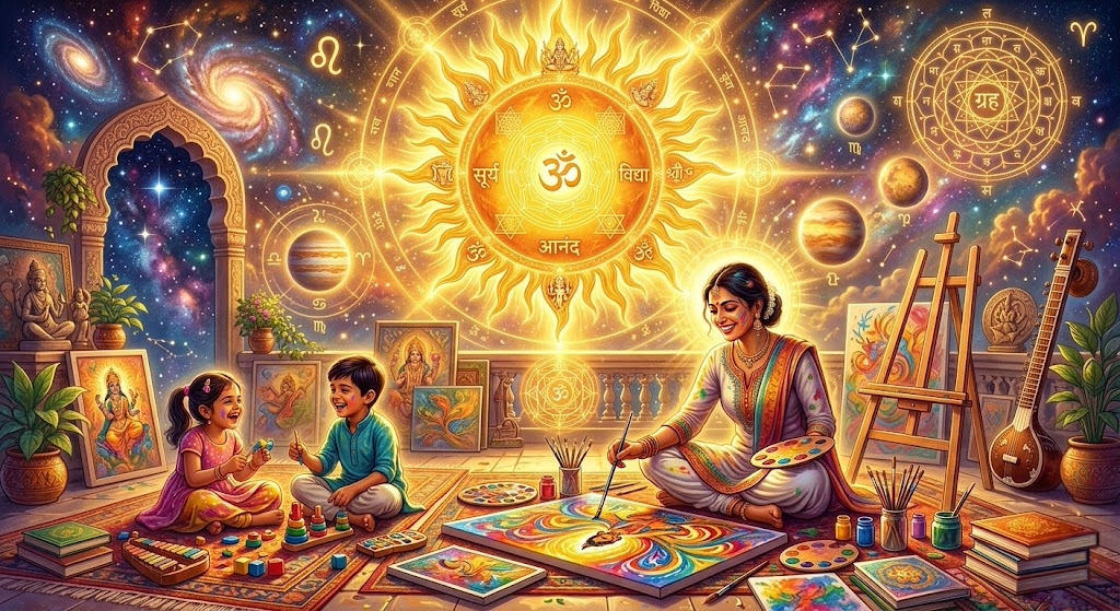 In Vedic astrology, the Sun represents authority, intelligence, creativity, and soul energy, while the 5th house (Putra Bhav) governs love, children, creativity, intelligence, and past life karma.